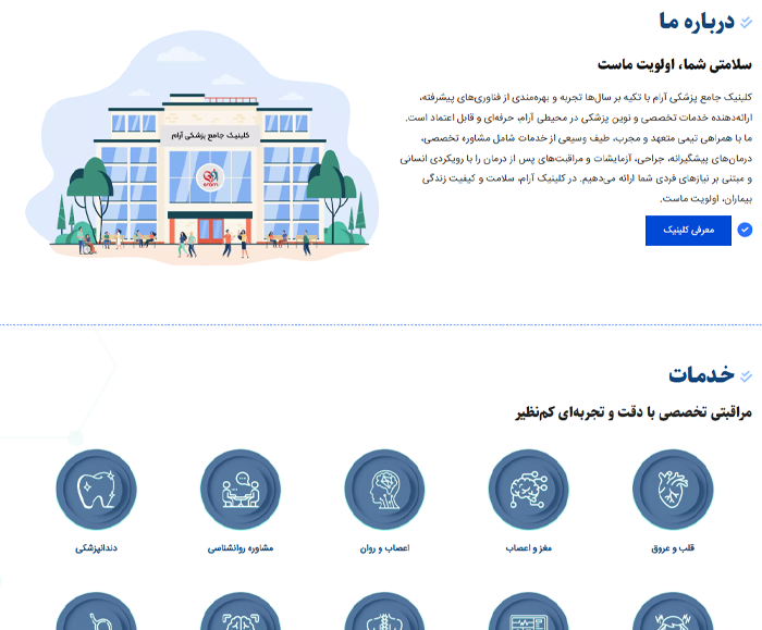 - بخش درباره ما: شامل تاریخچه، ماموریت، چشمانداز و معرفی مدیران ارشد